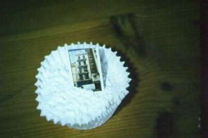 EL VIAJERO SOBRE EL MAR DE NUBES, 2000. 5000/u. harina, funda de magdalena y contacto fotográfico color. dimensiones variables. La Farinera del Clot de Barcelona.