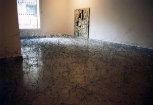 OTRAS MIRADAS, 1994. Intervención Site-specific para el Museu d’Art de Sabadell. Alambre de espino y técnica mixta sobre tela. Dimensiones variables.
